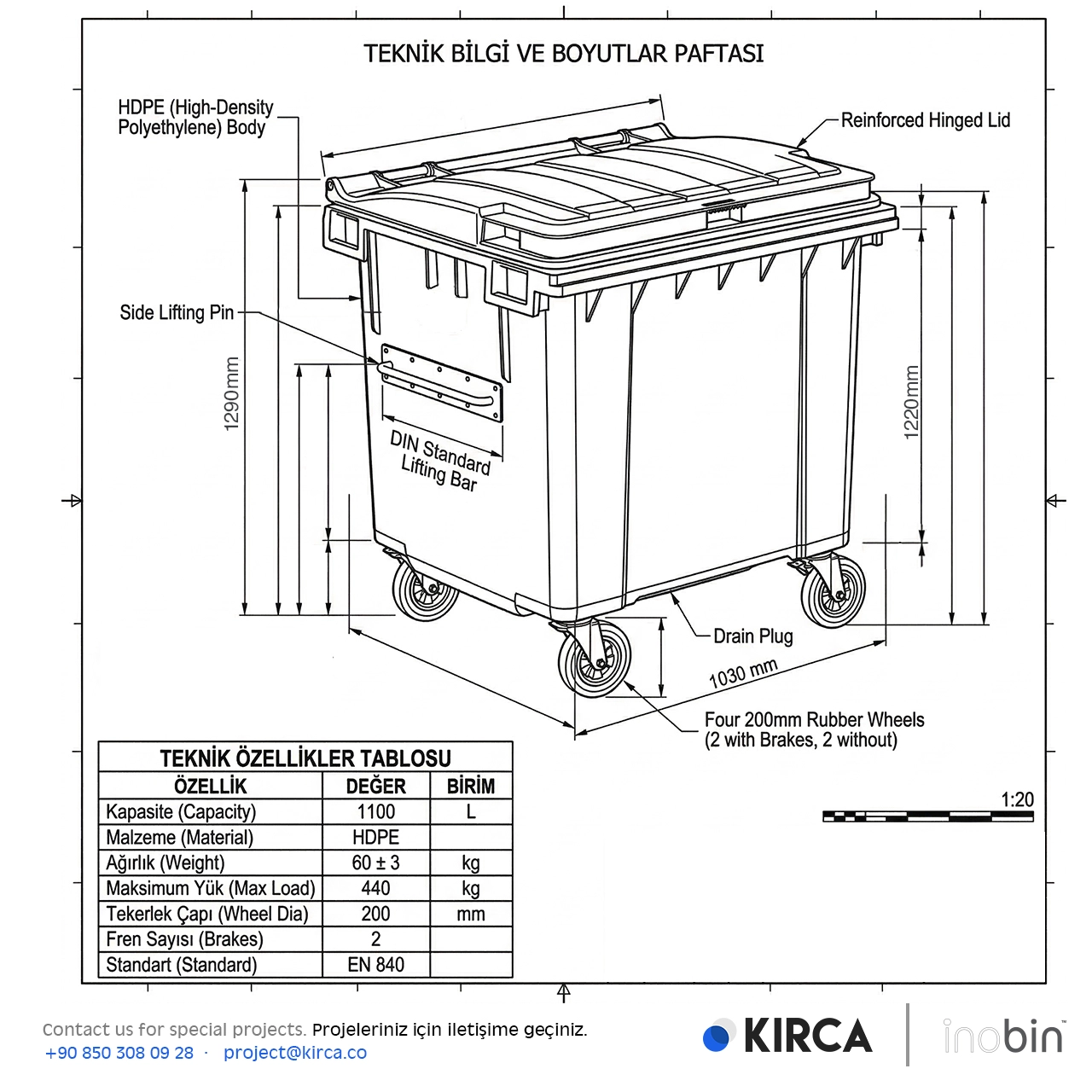 Yüksek yoğunluklu konteynerin et kalınlığı 5,6 mm (+/-0,2), boş ağırlığı ise 60kg (+/-%5) olması sebebiyle oldukça dayanaklıdır. Böylece 1.100lt’lik hacmine, yaklaşık 400 kg atık depolayabilirsiniz.