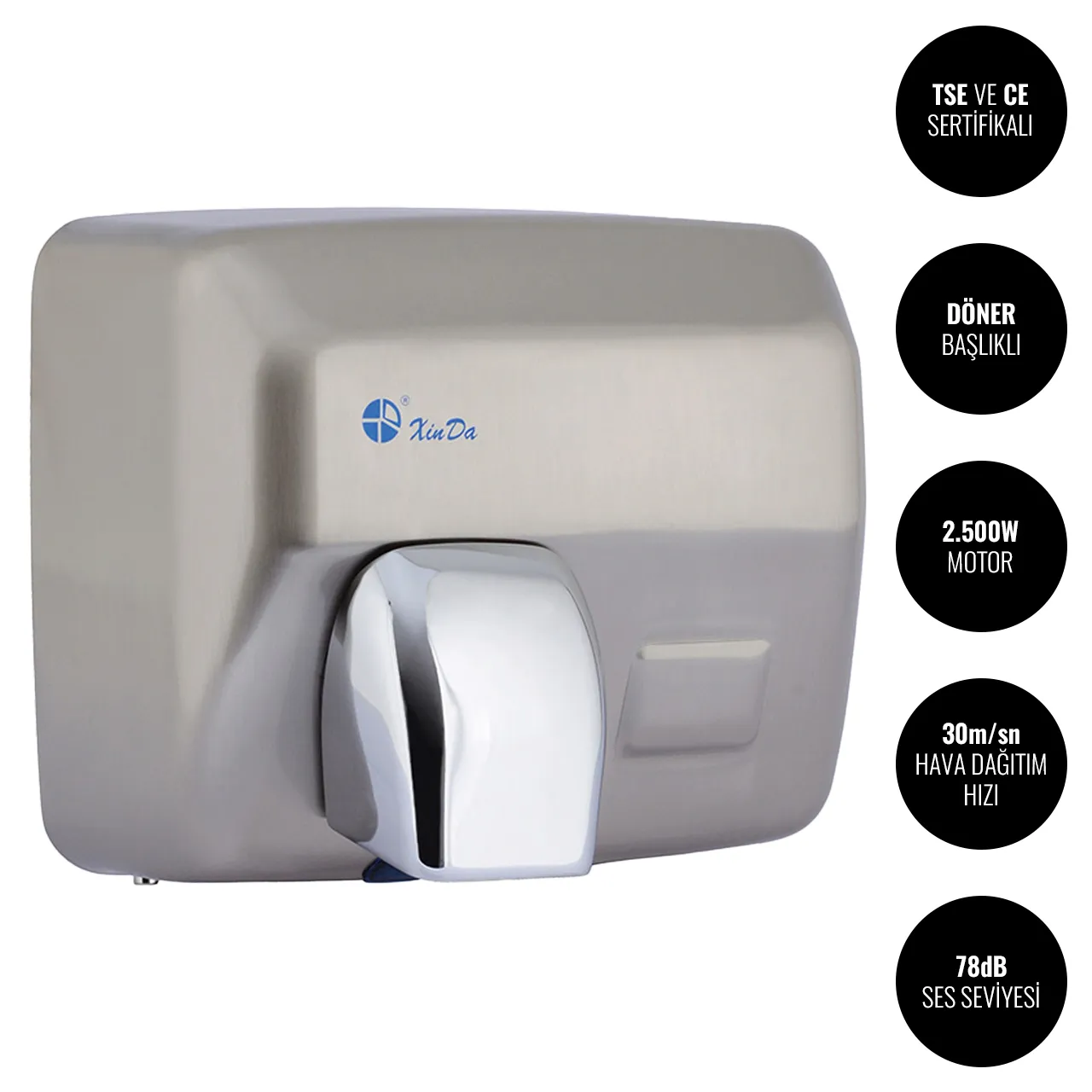 Xinda GSQ250B Döner Başlıklı Sensörlü El Kurutma Makinesi TSE, CE ve IPX1 sertifikalarına sahiptir. Dolayısıyla nemli özelikteki kapalı alanlarda güvenle kullanabilirsiniz.
