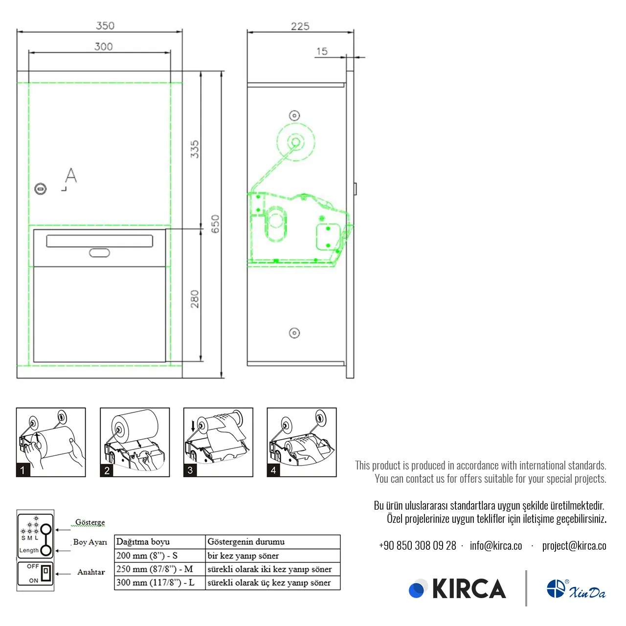 • 200, 250 veya 300mm olarak kağıt havlu boyunu ayarlayabilirsiniz. Böylece tüketimi denetleyip ekonomi sağlayabilirsiniz.