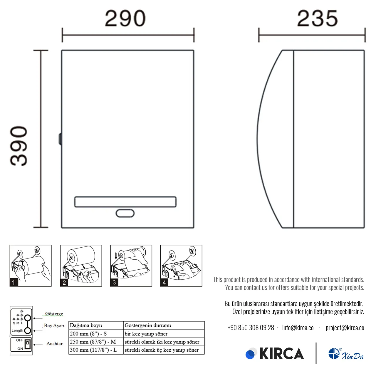 - 200, 250 veya 300mm olarak kağıt havlu boyunu ayarlayabilirsiniz. Böylece tüketimi denetleyip ekonomi sağlayabilirsiniz.