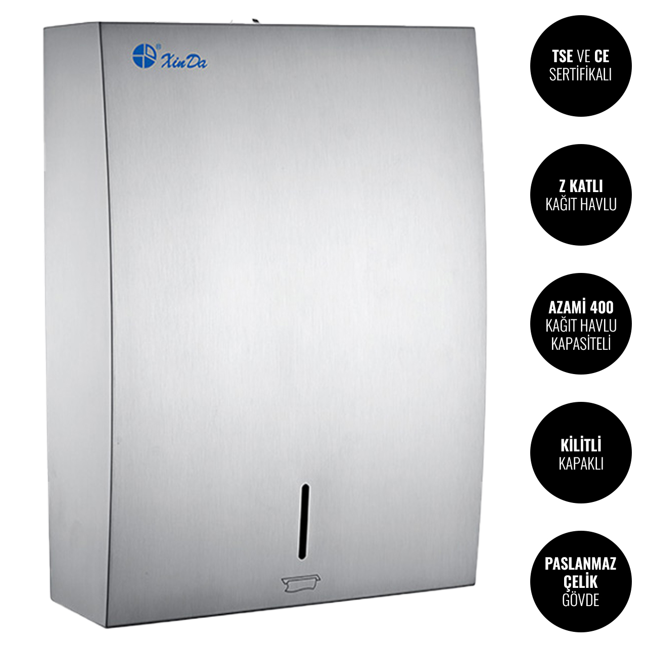 Xinda ZJH12H Manuel Z Katlı Kağıt Havlu Dispenseri geleneksel z katlı havlu kağıt dağıtımı özelliği ile ön plana çıkmaktadır. Manuel çalışır ve enerji tüketimini ortadan kaldırır. Yoğun sirkülasyonlu alanlarda sadece yeni kağıda temas edileceğinden hijyenik kullanıma uygundur.