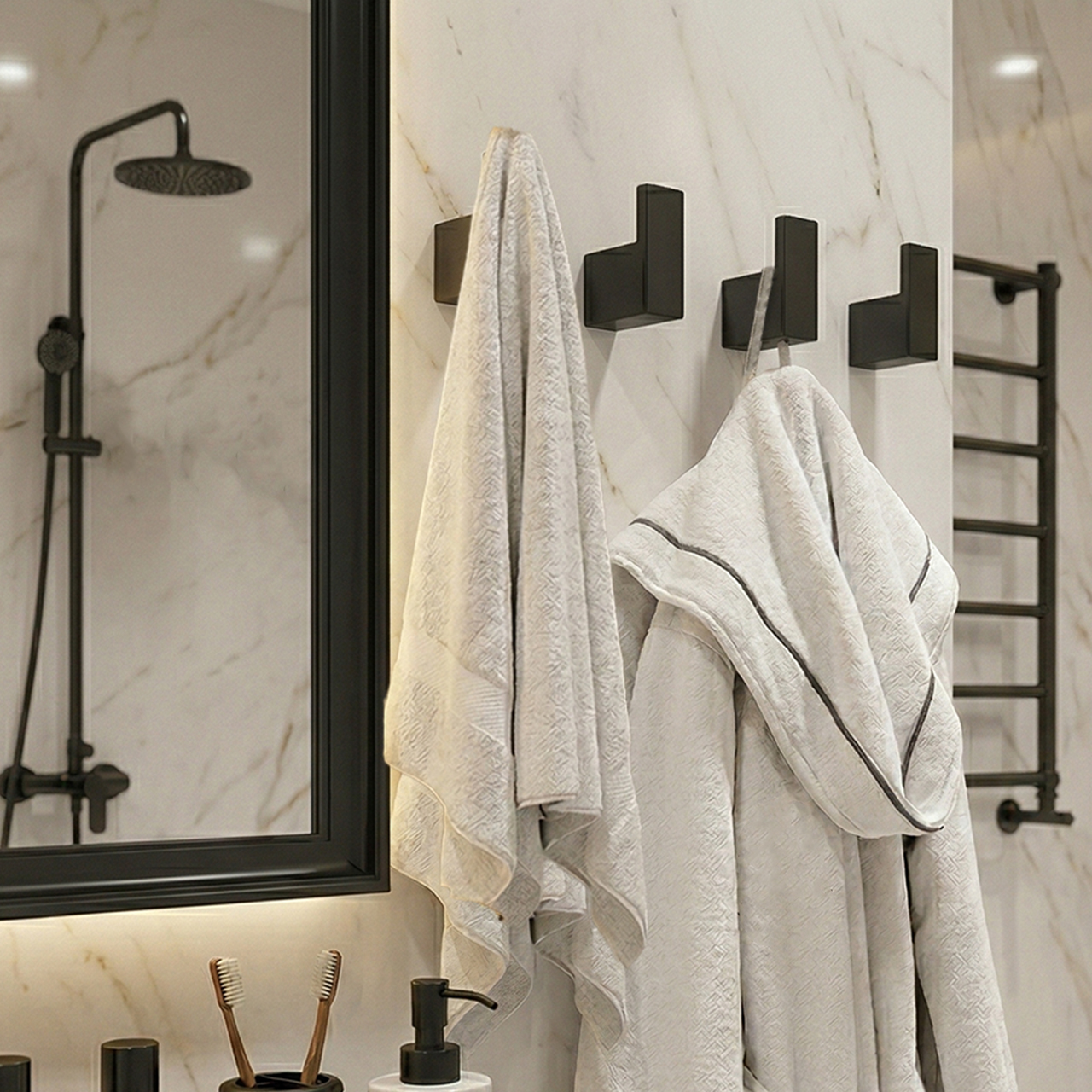 Gizli montaj bağlantısı ile premium görünümünü tamamlar. Böylece ihtiyacınız kadar askıyı kombine şekilde istenilen yüzeyde uygulayabilirsiniz. Bununla birlikte askı başına 5kg’a kadar ağırlık taşıyabilir. Dolayısıyla yoğun pamuklu bornozlarınızı dahi güvenle asabilirsiniz.